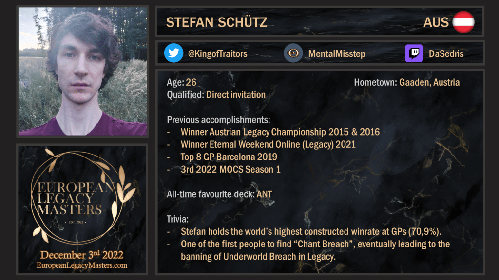 Finally there is Stefan Schütz, also known as MentalMisstep on MTGO, where he is a force to be reckoned with. Stefan took down the Legacy event of Eternal Weekend Online in 2021, but Grand Prix are where Stefan’s inner beast really comes out. In 181 recorded matches at GPs, Stefan managed to reach an incredible 127-53-1 record – amounting to a winrate of just over 70%, the highest recorded for any player. These stats were more than enough to convince the Austrian community to award Stefan a direct invitation to ELM, and we couldn’t agree more.