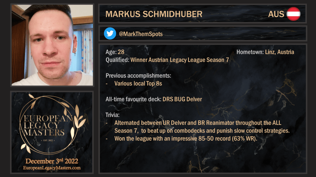 Joining Jonas, from Linz, we have Markus Schmidhuber, who qualified through consistency rather than spiking a single qualifer. Relying mostly on his skills with BR Reanimator and UR Delver, Markus dominated the latest ALL season, with an insane 63% winrate in over 135 matches. This was enough to earn him the second slot in Austria’s ELM squad.